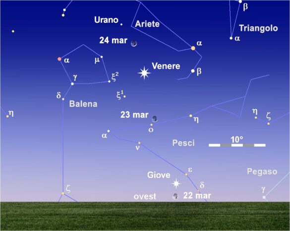Il cielo serale è dominato dalla brillante presenza di Venere che ha distanziato di ben 20° Giove, sempre più immerso nelle intense luci del tramonto. Nei giorni compresi tra il 22 e il 24 marzo, i due pianeti vengono affiancati dalla falce crescente della Luna, che viene a trovarsi in congiunzione con Giove, 1° a sud del pianeta, la sera del 22, poco dopo la loro scomparsa sotto l’orizzonte occidentale, con Venere, 1° a nord del nostro satellite naturale, la mattina del 24 e con il debole Urano nelle prime ore del 25.