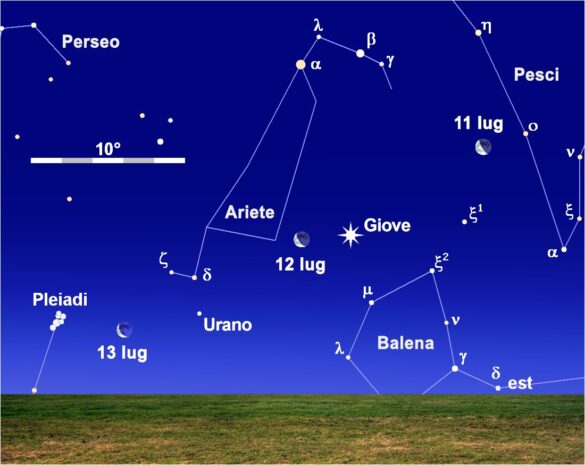 Nei giorni compresi tra l’11 e il 13 luglio i due pianeti vengono affiancati dalla falce calante della Luna, che viene a trovarsi in congiunzione con Giove, 1°,3 a nord del pianeta, la sera dell’11, alcune ore prima della loro levata dall’orizzonte nord-orientale, e con il debole Urano nelle ore serali del 12.