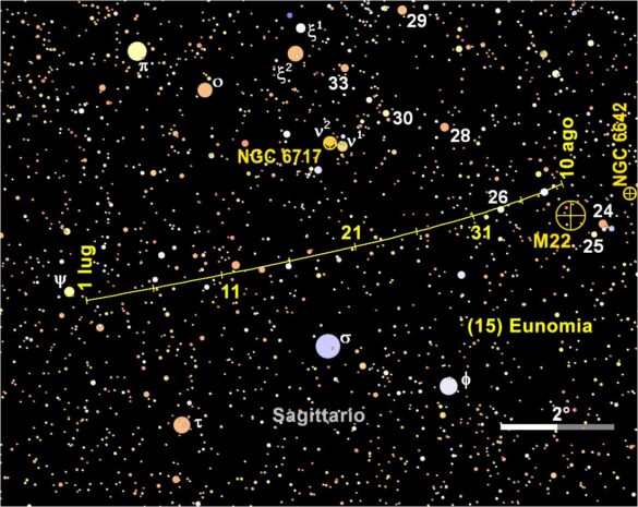 Altre due congiunzioni di rilievo sono quella con 26 Sagittarii, alcuni primi a nord della quale transita il 2 agosto, e quella con l’ammasso globulare M22, 33’ a nord-est del quale (15) Eunomia viene a trovarsi la notte tra l’8 e il 9 agosto.