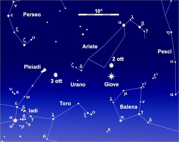 Nei primi giorni di ottobre i due pianeti vengono superati dalla Luna gibbosa calante, in congiunzione con Giove, 3°,1 a nord del pianeta, la mattina del 2 poco dopo l’inizio del crepuscolo nautico, e con Urano, 2° a nord di quest’ultimo la sera dello stesso giorno. La mattina del giorno seguente, dopo la levata dell’astro del giorno, il nostro satellite naturale transita poi 1° a sud delle Pleiadi.