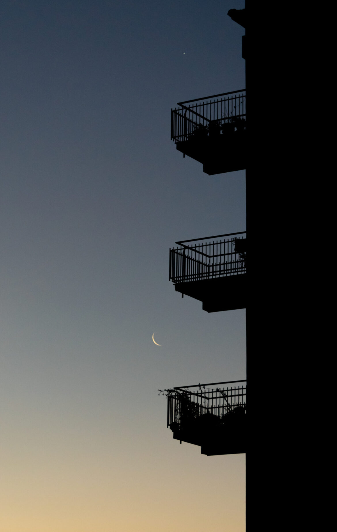 Note: Luna e Venere prospetticamente allineati nelle prime ore del mattino nel centro metropolitano di Catania. Il particolare allineamento con i balconi del palazzo sembrano suggerire una personificazione dei due astri. Chissà di cosa staranno parlando…