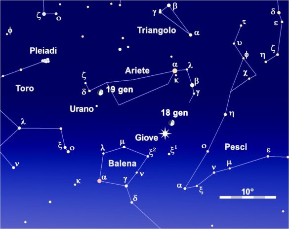 Al termine del crepuscolo serale, in prossimità del meridiano, a ben 60° di altezza, si può notare la brillante presenza di Giove, preceduto, un paio di gradi a nord-ovest, dal Primo quarto di Luna. Il nostro satellite naturale raggiunge la minima distanza apparente di 2°,2 dal pianeta poco prima delle 20:00, mentre la congiunzione in Ascensione Retta tra i due astri si verifica 3 ore dopo. La sera seguente la Luna si è spostata meno di 2° a est di Delta Arietis e 2°,5 a nord di Urano, con cui è in congiunzione alle 21:20 TC.
