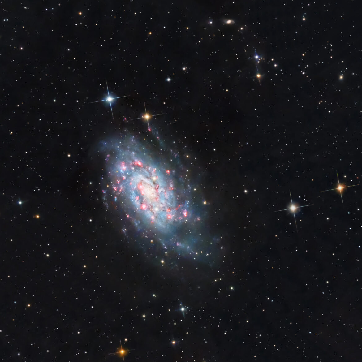Note: NGC 2403 (conosciuta anche come Caldwell 7) è una galassia a spirale intermedia nella costellazione della Giraffa distante circa 8 milioni di anni luce da noi e scoperta da William Herschel nel 1788. Questa galassia ha una spiccata somiglianza con M33, avendo un diametro di circa 50000 anni luce e poiché contiene numerose regioni H-alpha di formazione stellare. Il braccio a spirale settentrionale la collega alla regione di formazione stellare NGC 2404 che ha un diametro di 940 anni luce, rendendola una delle regioni H-apha più grandi conosciute. Questa regione ha una sorprendente somiglianza con NGC 604 in M33, sia per dimensioni che per posizione nella galassia.