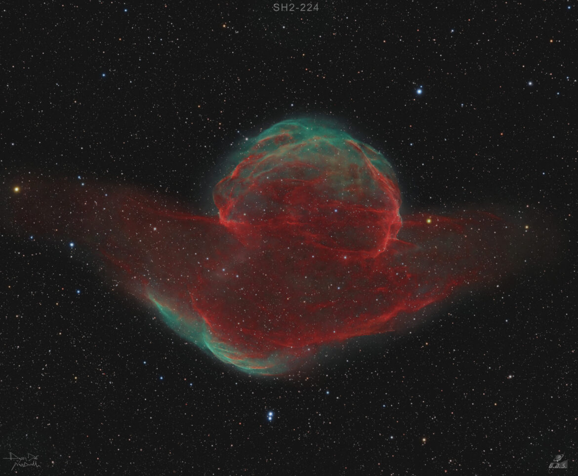 Note: Sh2-224 è un resto di supernova visibile nella costellazione boreale dell’Auriga. L’oggetto possiede una forma insolita , a me sembra un cappello da risaia o da gendarme , ha infatti una struttura a guscio ed è in interazione con una cavità del mezzo interstellare a una temperatura più elevata rispetto all’ambiente circostante, situata nella parte sudoccidentale e dalla forma ad arco. La distanza della struttura è stimata sui 14700 anni luce dal sistema solare,in una regione periferica del Braccio di Perseo. Tramite lo studio ai raggi X si è determinata un’età della struttura compresa fra 13.000 e 24.000 anni. Ripresa in diverse notte a cavallo tra il vecchio e il nuovo anno per circa 33 ore sono soddisfatto della resa dei 2 gas interagenti , l’Idrogeno di colore rossastro e l’Ossigeno verde , queste riprese singole a banda stretta con filtri Ha e O3 le ho unite ad una sessione a banda larga in RGB con i 3 diversi filtri separatamente per dare piu’ colore al nucleo della supernova e per le stelle.