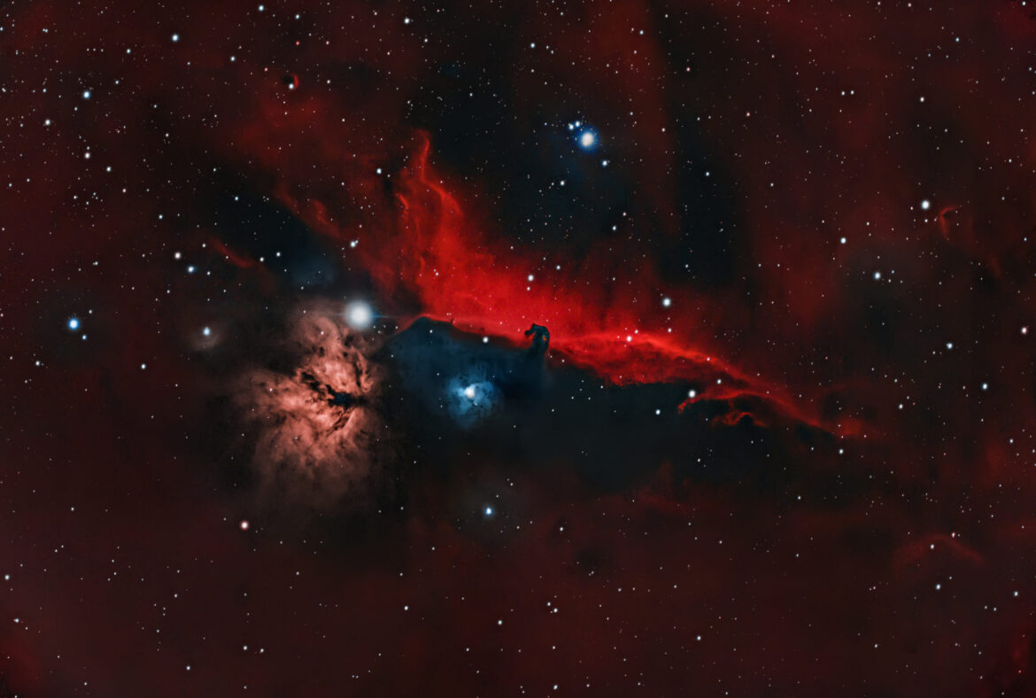 Note: La stella Alnitak illumina una delle zone più belle del cielo invernale, quello che comprende la nebulosa Fiamma Ngc2024, la Testa di Cavallo B33 con la nebulosa Ic434 alle sue spalle. La Testa di Cavallo è sicuramente quella più ammirata e fotografata, e dista circa 1.500 anni luce dalla terra. Queste nebulose si trovano proprio sotto la famosa Cintura di Orione, nell’omonima costellazione