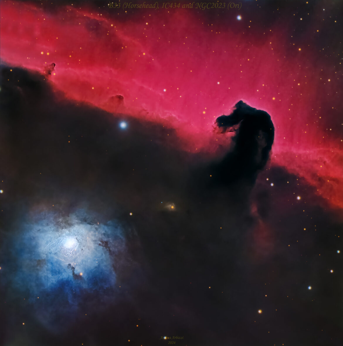 Note: B33 (“Testa di Cavallo”) è una nebulosa oscura che si staglia contro il bagliore rossastro della nebulosa ad emissione IC434, originata dall’idrogeno ionizzato da Sigma Orionis. In basso a sinistra risplende la piccola nebulosa azzurra a riflessione NGC 2023.