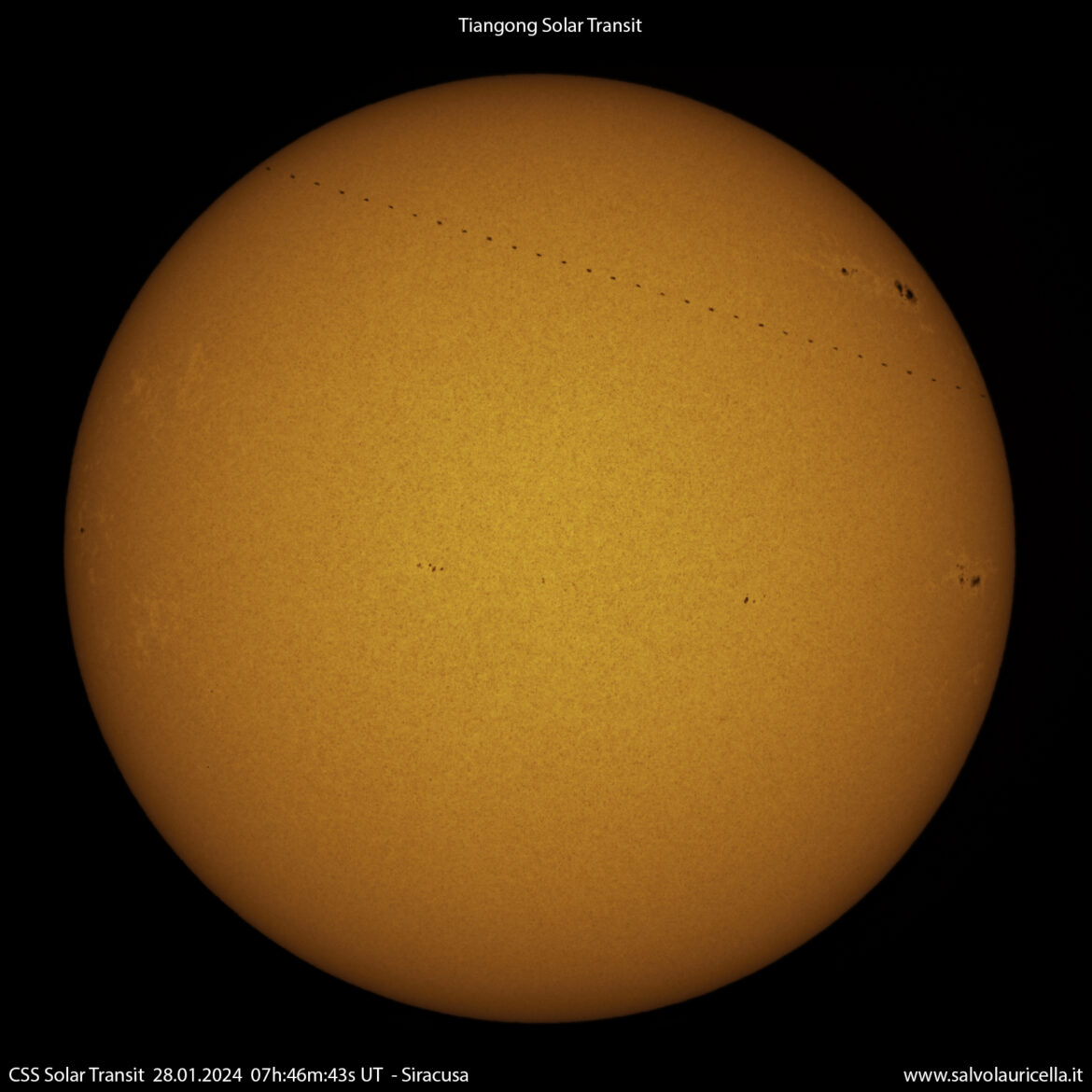 Note: Transito della stazione spaziale cinese (Tiangong) sul Sole ripreso da Siracusa il 28 gennaio 2024.