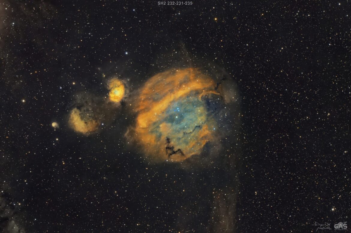Siamo nella Costellazione dell’Auriga e questo complesso molecolare e’ formato da diverse nebulose , la piu’ grande al centro e’ la SH2-232 , al suo fianco la SH2-235 è anche la più attiva e presenta al suo interno diversi oggetti stellari nelle prime fasi della loro vita , piu’ a sinistra la SH2-231 la piu’ debole delle tre , infine il punto blu (al centro della SH2-232) è una nebulosa planetaria conosciuta come PN G173.5+03.2.