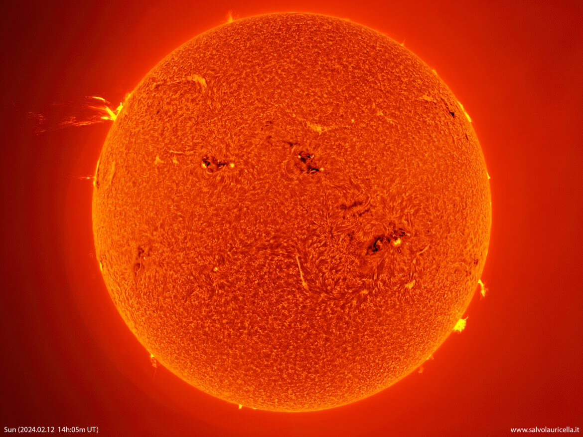 Note: Spettacolare protuberanza sul Sole ripresa il 12.02.2024 alle 14:05 UT. Lunghezza approssimativa di circa 350.000 km, pari alla distanza Terra-Luna!!!