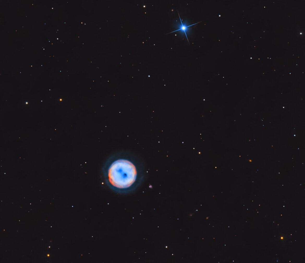 Messier 97 (M97), conosciuta anche come Nebulosa Civetta o NGC 3587, è una famosa nebulosa planetaria situata nella costellazione dell’Orsa Maggiore a una distanza di circa 2030 anni luce dalla Terra. Si stima che abbia circa 8000 anni e si è formato dal deflusso di materiale proveniente dal vento stellare della stella centrale che da stella gigante è diventata una nana bianca di 14a magnitudine (visibile nella mia foto). La nebulosa è disposta in tre gusci concentrici, di cui il guscio più esterno (l’alone di OIII) è circa il 20–30% più grande del guscio interno. E’ stata chiamata Nebulosa Civetta per via della sua apparenza alla vista telescopica, che rivela due macchie scure che sembrano gli occhi di un gufo.