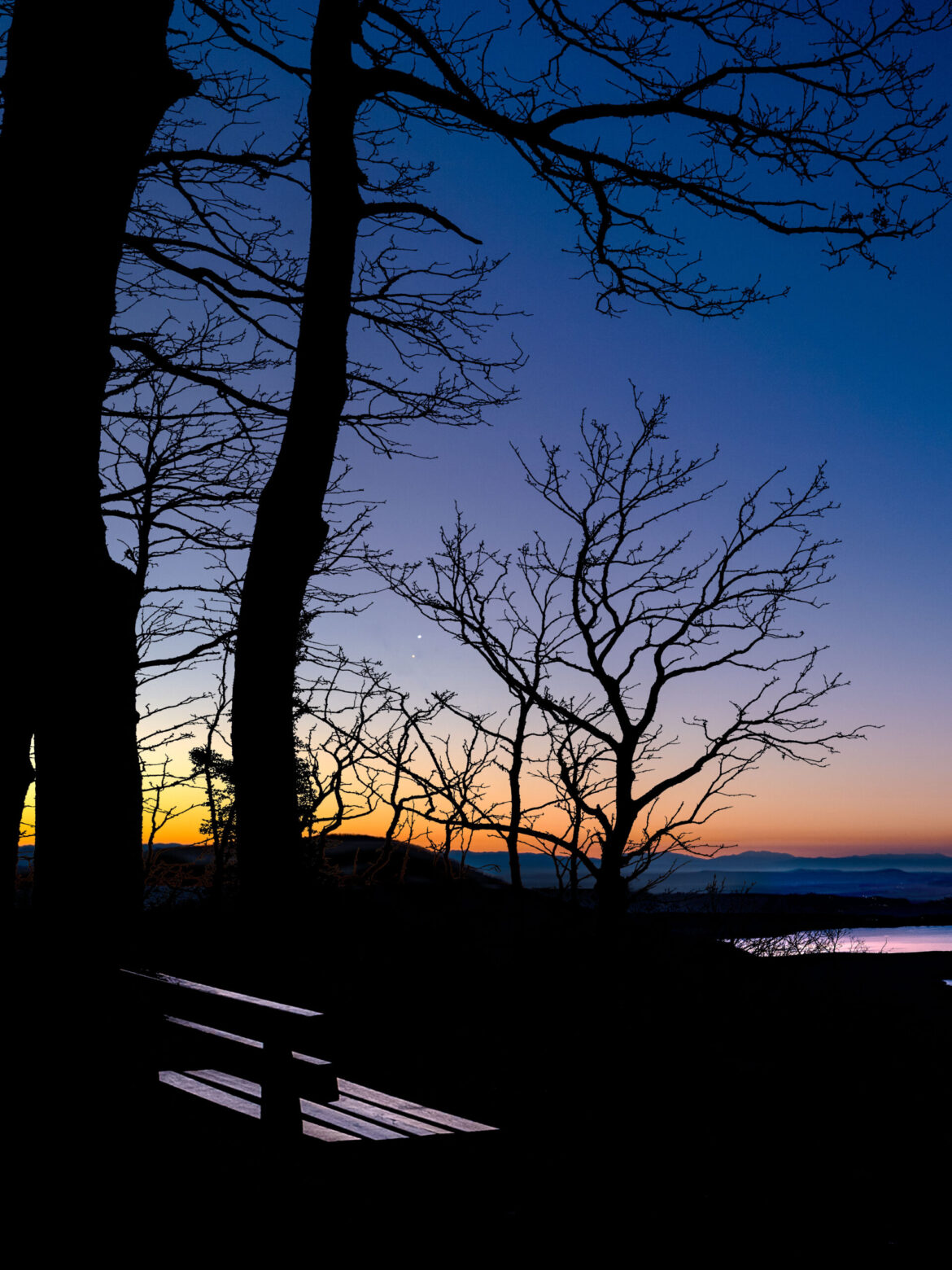 Congiunzione Marte (in basso) – Venere (in alto) sopra il Lago di Vico (Vt), 21 Febbraio 2024, ore 06:39 LT. Dati di ripresa: Nikon Z9 a 100Iso, Esposizione pari a 1/15, Nikon Z14-24/2.8S a 16.5mm chiuso ad f/5. PS. i pianeti sono tra i rami sopra la panchina.