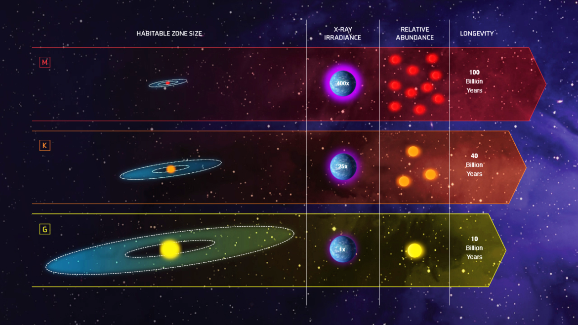 Le stelle M rappresentano quasi il 75% delle stelle e circa la metà della massa stellare nella nostra Galassia. Le stelle M potrebbero essere un buon punto di partenza per la ricerca della vita su altri pianeti, in quanto i dati statistici su un numero così elevato di stelle possono dare speranza di sistemi abitabili planetari.