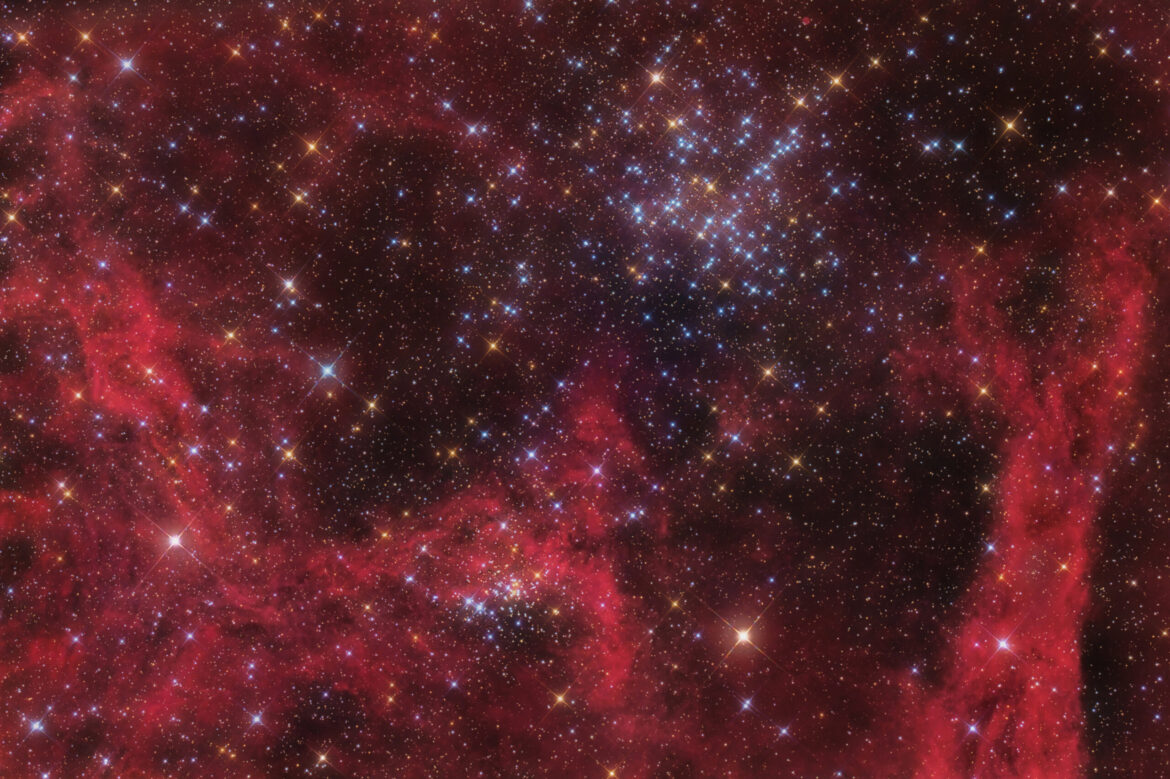 Entrambi gli ammassi stellari sembrano galleggiare in un mare di nuvole di H-alpha. Tuttavia, queste appartengono alla nube molecolare di Toro, che, a una distanza di “solo” circa 430 anni luce, è la regione di formazione stellare più vicina alla Terra.