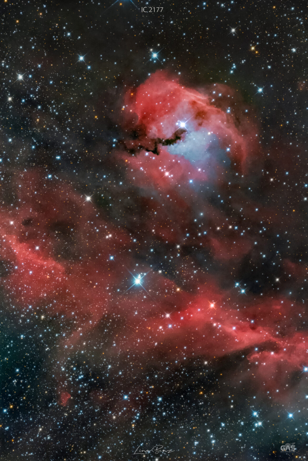Note: IC 2177 (nota anche come vdB 93 e Gum 1) è una nebulosa a emissione e a riflessione visibile nella costellazione dell’Unicorno. Si individua sul bordo occidentale della Nebulosa Gabbiano, una grande regione H II connessa ad un complesso nebuloso molecolare in cui hanno luogo fenomeni di formazione stellare, e costituisce idealmente la “testa” del volatile, la sua posizione è circa 3° a ENE di θ Canis Majoris, una stella di colore arancione di quarta magnitudine. Appare come una nube dalla forma rotondeggiante, con una densa linea scura che la attraversa da nord e una fascia luminosa arcuata che si protende in direzione sud; la sua luminosità le consente di essere fotografata con semplicità anche con degli strumenti amatoriali di media potenza e osservata tramite appositi filtri. Tele SW Newton 200/1000 PDS @950 riduttore TS . Camera Qhy294c pro guida phd2 con Asi 224, mont. Eq6r pro, ligth 133 da 120″ tot. 4h e 26 minuti, filtro Optolong L-Quad, software di acquisizione N.I.N.A. stacking DSS elab GraXpert + Photoshop.