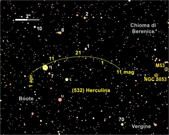 Il giorno 8 è in opposizione al Sole (532) Herculina, un asteroide esteso circa 200 km e appartenente alla Fascia principale, scoperto nell’aprile 1904 ad Heidelberg dall’astronomo tedesco Max Wolf. Di magnitudine +9,1, lo si può rintracciare alcuni gradi a ovest di Arturo, la luminosa stella Alfa del Boote, nei pressi della stella Eta Bootis, di mag. +2,7, con la quale il pianetino è protagonista di un incontro ravvicinato la mattina del giorno 6, quando transita 12’ a nord-est dell’astro.