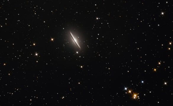 La Sombrero Galaxy La Galassia Sombrero (conosciuta anche con le sigle M 104 o NGC 4594) è una galassia nella costellazione della Vergine. La sua vista di taglio con la sua banda oscura l’ha resa famosa ed è un oggetto privilegiato nella fotografia astronomica amatoriale, dista da noi circa 29,5 milioni a.l. Telescopio S-W Newton 200/1000 mm con riduttore TS