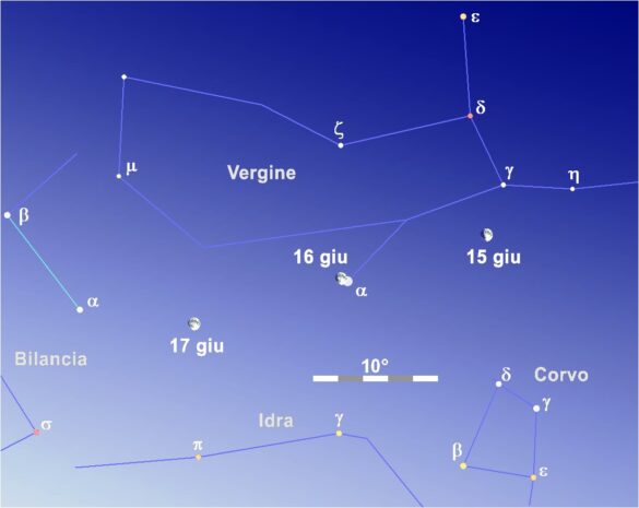 A metà mese, tra le luci del crepuscolo serale che vanno attenuandosi, è ben visibile, in prossimità del meridiano, l’estesa costellazione della Vergine, entro i cui confini sta transitando la Luna gibbosa crescente. La sera del 16, nelle immediate vicinanze nostro satellite naturale è possibile notare la brillante presenza di Spica (Alfa Virginis), con la quale la Luna è in congiunzione, 34’ a nord della stella, quasi contemporaneamente alla calata del Sole. Grazie al ridotto valore della distanza, il nostro satellite occulta Spica, ma l’evento è visibile soltanto da parte della Finlandia e della Russia occidentale.