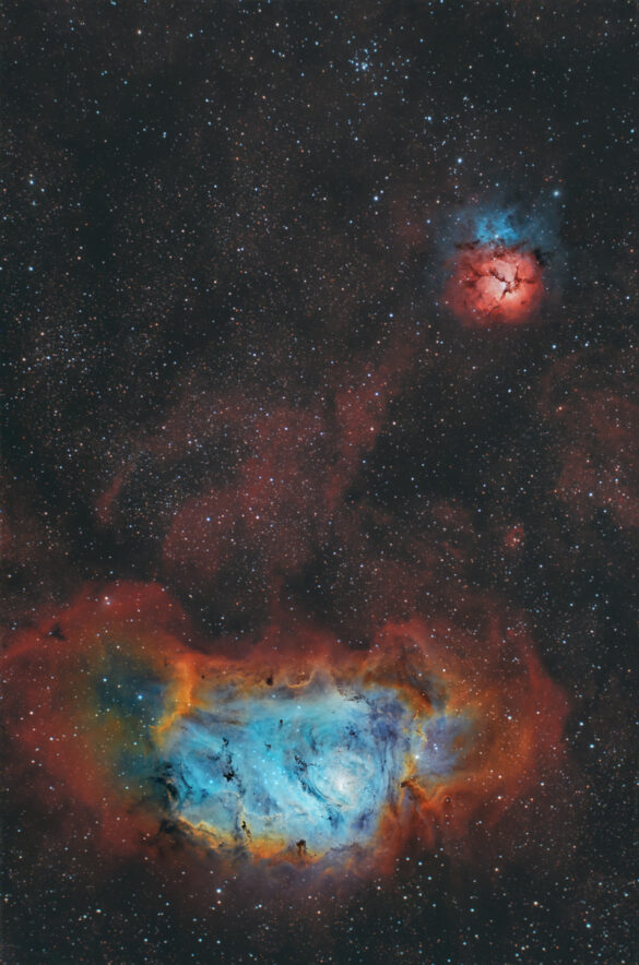 Per il campo largo: Optolong L-Pro 50*300″, gain 120, T -5° con Ed72 Per il dettaglio di M20: Optolong L-Pro 60*300″, gain 120, T -5° con newton 200/800 Per il dettaglio di M8: Antlia Alp-t 60*300″ gain 120, T -5° con Askar 120APO Optolong S2 60*300″ gain 120, T -5° con Askar 120APO