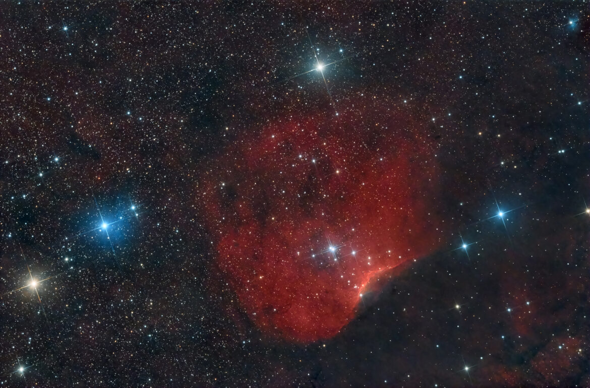 Avevo iniziato a riprendere questa nebulosa interamente in banda stretta perché ero convinto che fosse una regione puramente ad emissione H-alpha ma poi, andando a cercare informazioni, ho scoperto che c’è anche una forte dominante a riflessione in questa zona del Cefeo, per cui ho dovuto rivedere il progetto iniziale e cominciare a darci dentro di banda larga, collezionando quasi 25h di dati.