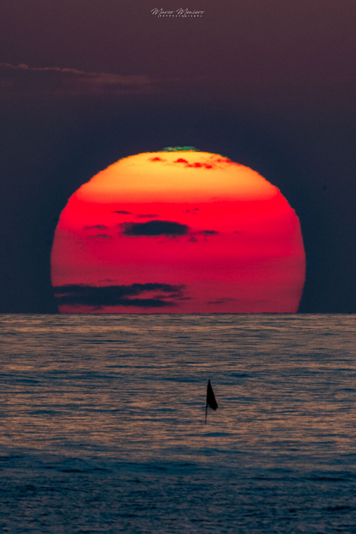 Definizione di raggio verde (World Meteorological Organization): A predominantly green coloration of short duration, often in the form of a flash, seen at the extreme upper edge of the Sun, Moon or sometimes even a planet when disappearing below or appearing above the horizon.