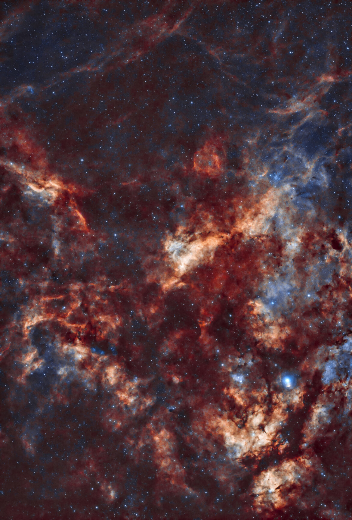 L’immagine riprende un campo intricato di idrogeno ionizzato, parte del grande complesso nebuloso molecolare nella costellazione del Cigno, una delle aree nebulose più grandi e massicce della nostra Galassia.