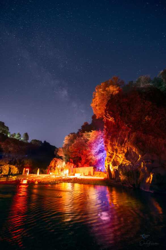 Tutti conoscono il verso scritto dal sommo poeta al termine della prima cantica: “E quindi uscimmo a riveder le stelle.”. Ma gli astri sono protagonisti anche dell’ultimo verso del Purgatorio: “…puro e disposto a salir le stelle” e dell’ultimo del Paradiso: “…l’amor che move il sole e l’altre stelle.”. E cosi la Via Lattea diventa la protagonista di questa immagine che ci racconta uno dei momenti della rappresentazione dell’Inferno di Dante presso le Gole dell’Alcantara. Luci rosse illuminano la scena dove Dante e Virgilio si apprestano a parlare con Ulisse mentre le anime dei dannati danzano lamentandosi sulla riva del fiume. Questo a sua volta diventa metafora dei fiumi infernali primo tra tutti l’Acheronte e poi lo Stige. La gola su cui scorre il fiume diventa il perfetto scenario per rappresentare i gironi e le bolge. Ed è così che le stelle diventano testimoni dell’incontro di Dante con Virgilio, Caronte, Paolo e Francesca, Farinata degli Uberti, Ulisse, il Conte Ugolino e Lucifero. Ogni canto viene recitato alla perfezione e ci si commuove nel profondo nel vedere Francesca parlare del suo amore con lenta cadenza ma con appassionato ardore. Alla fine la rappresentazione non può che concludersi perfettamente con i protagonisti accompagnati per l’appunto dalla Via Lattea: “e quindi uscimmo a riveder le stelle!”