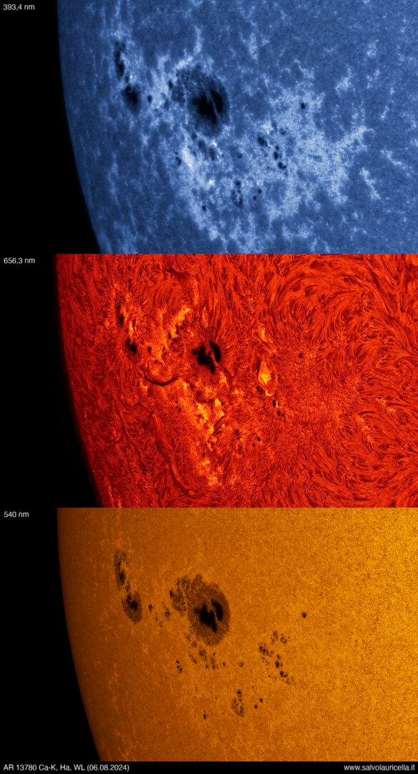 La regione 13780 attiva ripresa nella riga Ca-K, H-alfa e in luce bianca