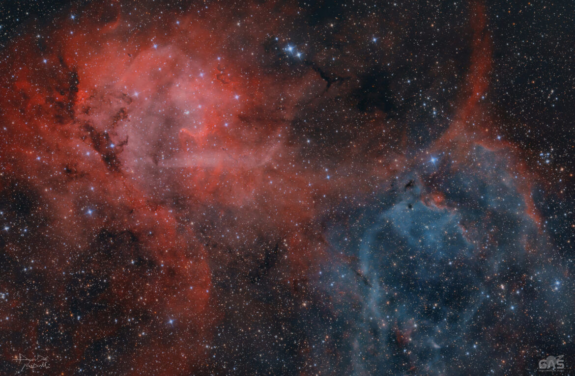 Sh2-132 , conosciuta anche come Nebulosa Leone , è un’estesa nebulosa a emissione visibile nella costellazione di Cefeo. Si trova ad una distanza di circa 10.400 anni luce, all’interno del braccio di Perseo. Le stelle responsabili della ionizzazione del gas sono molto calde e massicce. In particolare, sono state identificate due stelle Wolf-Rayet, chiamate HD 211564 e HD 211853 .Le stelle di Wolf-Rayet sono estremamente calde, luminose e massicce, e sono una delle classi di stelle più rare conosciute. Nel 2018, ne erano state identificate solo 154 nella Via Lattea. Alcune producono nebulose spettacolari, grazie ai loro forti venti stellari, alle intense emissioni ultraviolette e alle nuvole di gas che emettono nelle prime fasi della loro vita relativamente breve. Si individua sul bordo meridionale della costellazione, a breve distanza dal confine con la Lucertola, lungo il piano della Via Lattea; il periodo più indicato per la sua osservazione nel cielo serale ricade fra i mesi di luglio e dicembre ed è notevolmente facilitata per osservatori posti nelle regioni dell’emisfero boreale terrestre. Ripresa per 2 notti , il 6 e 7 Agosto 2024 , per circa 11 ore usando filtri a banda stretta HA e OIII.