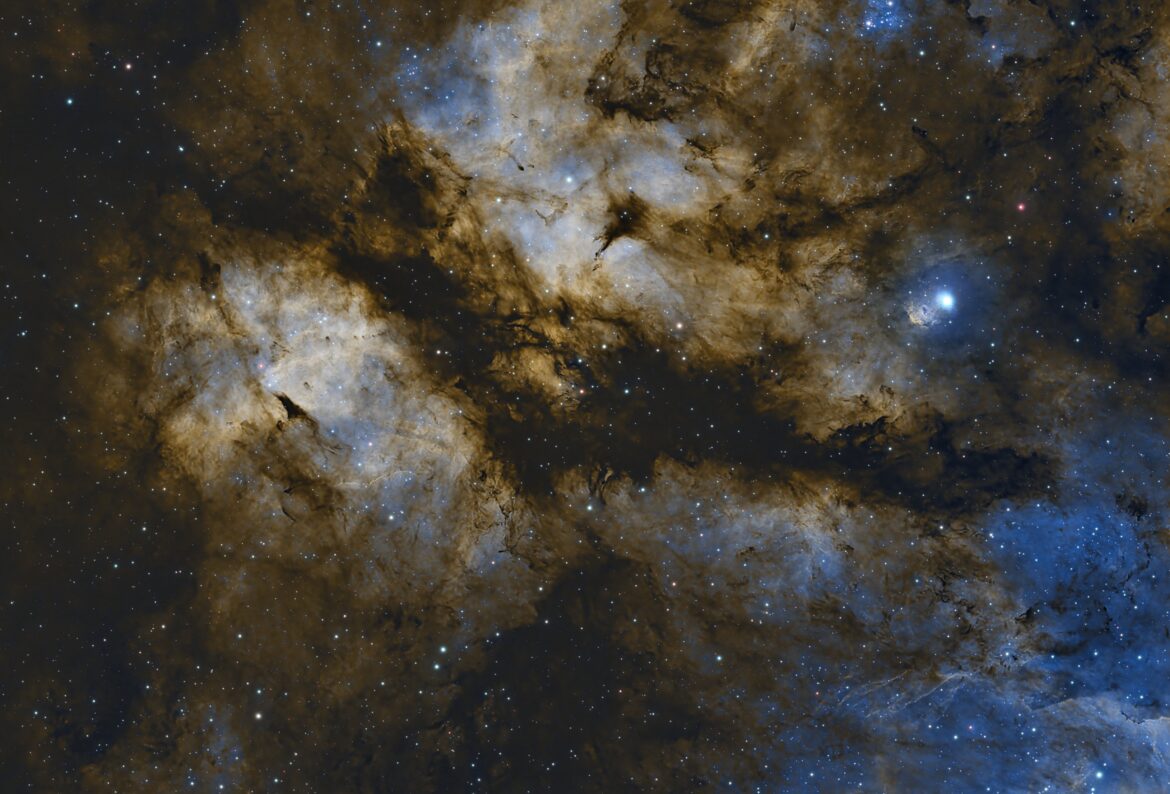 La Nebulosa Farfalla, catalogata IC1318, si estende per 100 anni luce e dista 1226 Parsec. Situata nel cuore della costellazione Cygnus, proprio accanto a Sadr, è costituita da un’unica nebulosa che viene tagliata a metà da LDN889, una nebulosa oscura molto grande, dando così forma ad una farfalla cosmica. Gli intricati schemi nel gas chiaro e nella polvere scura sono causati da complesse interazioni tra venti interstellari, pressioni di radiazione, campi magnetici e gravità.
