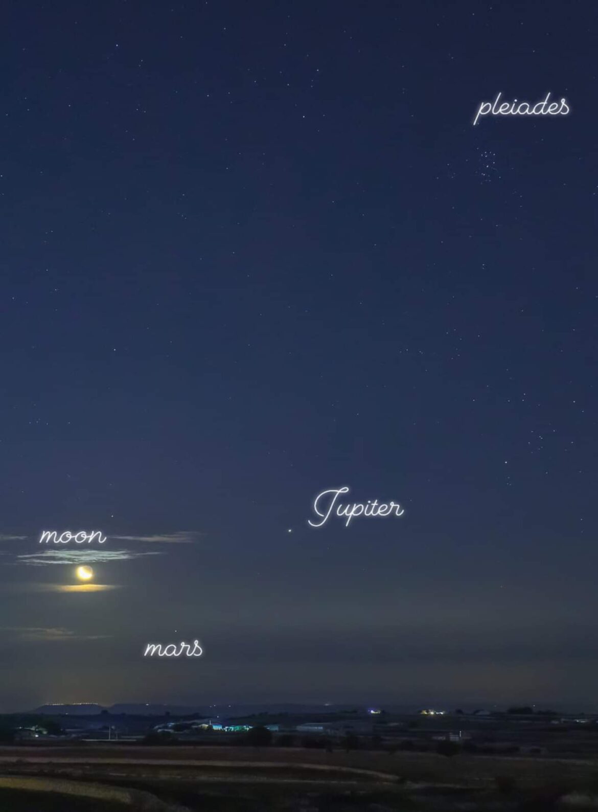 Foto di GIOVANNI PASSALACQUA: Congiunzioni – Luna, Giove, Marte, Pleiadi sopra Ragusa