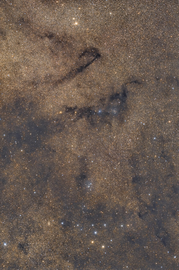 Ci troviamo in una delle più piccole costellazioni nella volta celeste, quella della Volpetta, situata al centro del Triangolo Estivo, un asterismo formato dalle stelle Deneb, Vega e Altair. Si tratta di una spettacolare regione dove due nebulose oscure sembrano galleggiare in un immenso lago di stelle: diversi LDN e LBN (LBN 133 e 134, LDN 768, 769, 772, 773, 774, 775, 779) formano le strutture della nebulosa oscura che ricorda la forma del “Mostro di Loch Ness” e l’ altra il manico di un ombrello (LDN778).