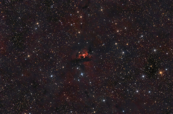Si tratta di una regione H II situata sul bordo più esterno del Braccio di Orione e visivamente sembra circondata dalla nebulosa oscura LDN 1317. La distanza è stata stimata tramite studi spettrofotometrici in circa 4700 anni luce, tramite l’osservazione delle stelle eccitatrici dei gas di questa e di altre nubi circostanti.