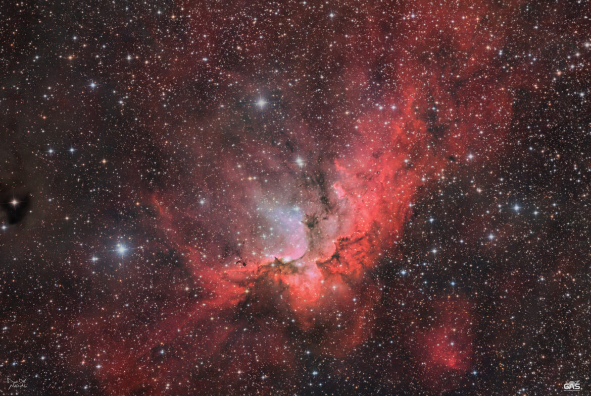 Scoperto nel 1787 da Caroline Herschel, sorella del celebre William, NGC 7380 – conosciuta anche come Wizard Nebula – è un ammasso aperto, ossia un denso gruppo di stelle giovani nate a partire dalla stessa nube di gas e polveri e ancora soggette alle reciproche interazioni gravitazionali. I gas residui di questa nube, che ancora oggi avvolgono in parte l’ammasso, vengono scaldati e ionizzati da alcune delle stelle ivi presenti come ad esempio la DH Cephei, una stella binaria di magnitudine 7,6 che costituisce una delle componenti più massicce dell’ammasso, e questo rende visibile la vera e propria Wizard Nebula in tutti i suoi sgargianti colori: soprattutto il rosso, segno di abbondante presenza di idrogeno, ingrediente fondamentale per la creazione di nuove stelle.