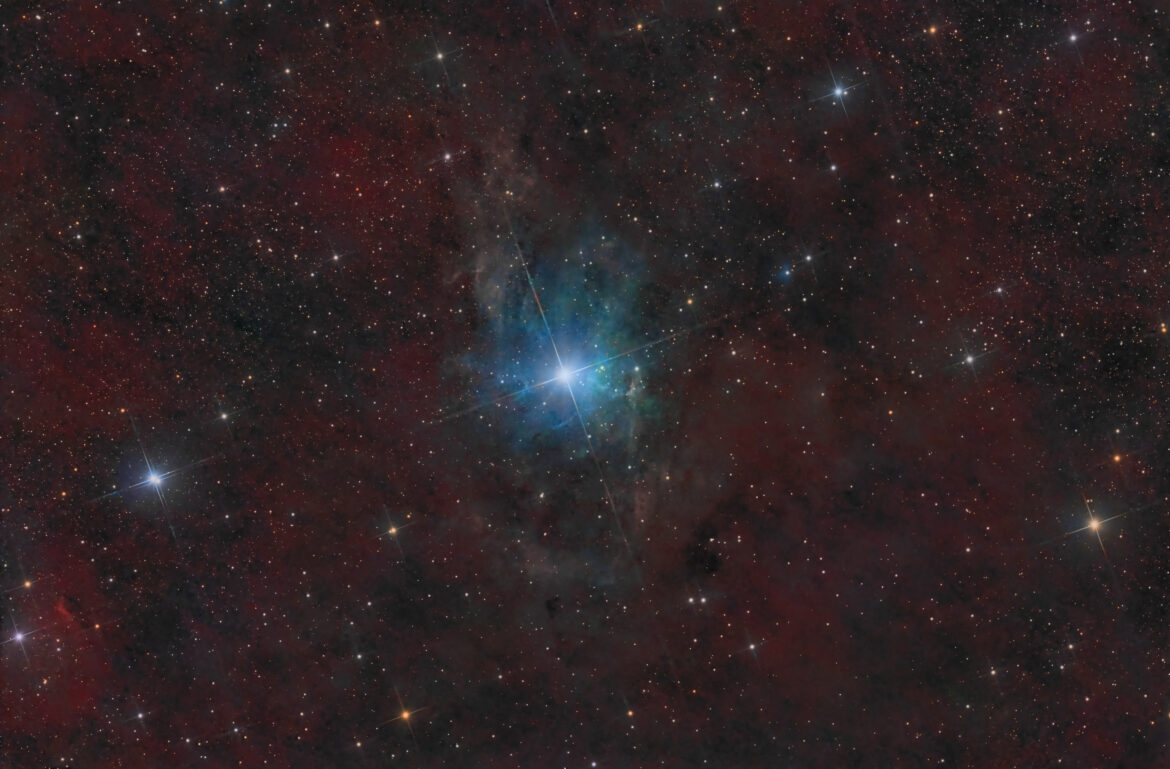 Al limite delle mie possibilità da cielo cittadino inquinato, ho voluto fotografare questa nebulosa che inseguivo da un paio d’anni nella costellazione della Giraffa. Si tratta della nebulosa a riflessione catalogata come vdB 15, illuminata dalla stella HD 21389 che con i suoi spike fa bella mostra al centro di questa foto ottenuta con una composizione HaRGB.