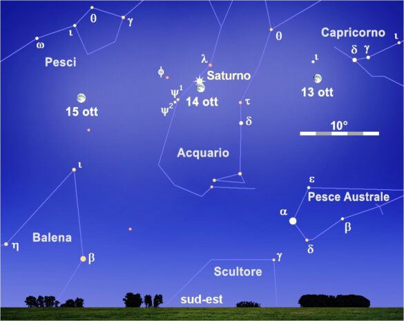 Il giorno 14, tra le luci del crepuscolo serale che vanno spegnendosi, alta sull’orizzonte sud-orientale è possibile ammirare una bella configurazione celeste, con protagonisti Saturno e la Luna gibbosa crescente. Il nostro satellite naturale, il cui disco, del diametro di oltre 33’, è in gran parte illuminato, si trova 47’ “sotto” il pianeta inanellato, con il quale si è trovato in congiunzione in Ascensione Retta meno di un’ora prima, producendo un’occultazione visibile da parte dell’Africa meridionale, oceano Indiano, India e Cina.