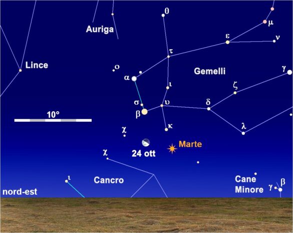 Poco meno di 4° “sopra” la Luna si può notare la presenza di Polluce (Beta Geminorum), più debole di una magnitudine rispetto a Marte, 2°,5 a sud del quale il nostro satellite è transitato il pomeriggio del 23.