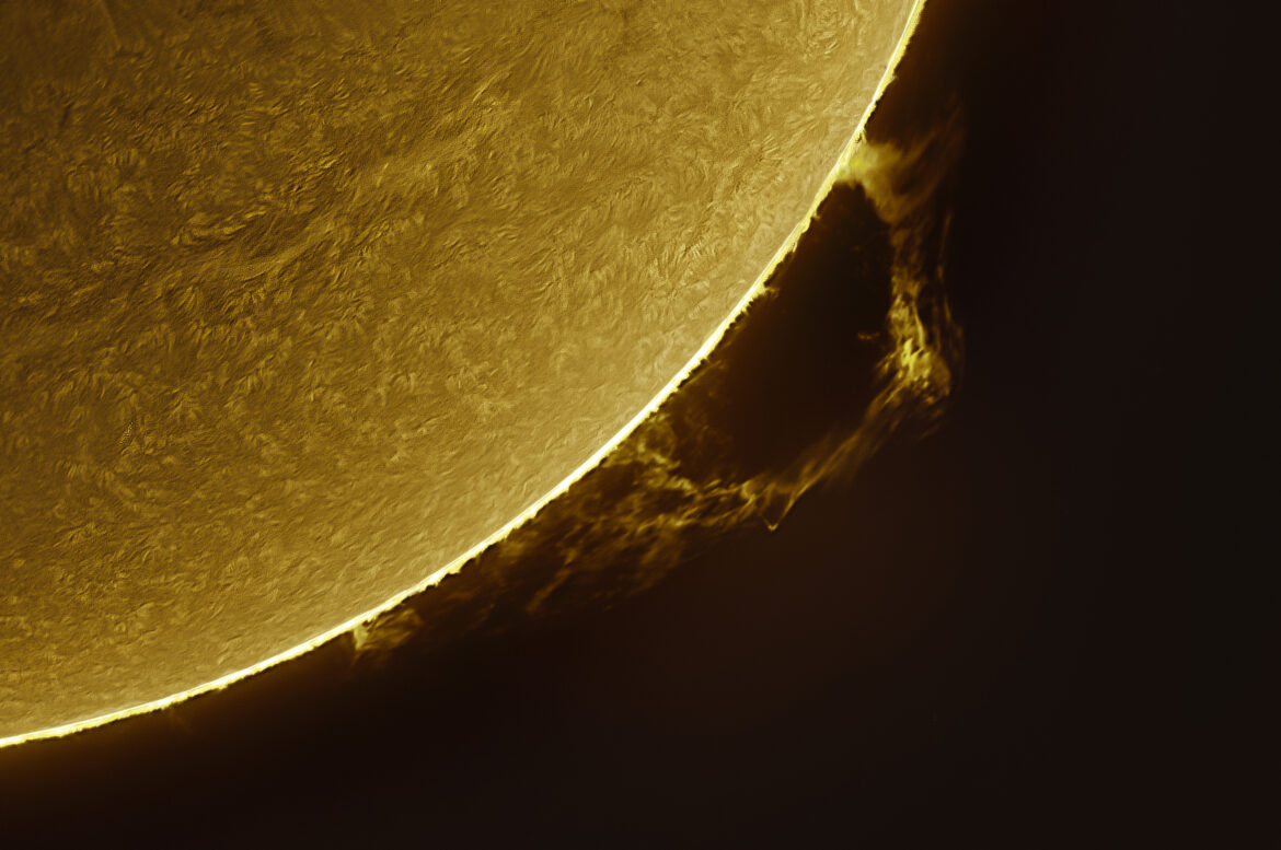 Telescopio Tecnosky 80 Edt, fotocamera Asi174mm, montatura Ioptron Gem 28, filtro Daystar Quark H-Alpha Chromosphere, tappi piatti Daystar, filtro Artesky Uv/Ir cut, filtro Player One ERF 1.25″, elaborazione Sharpcap, Autostakkert, Imppg, Photoshop