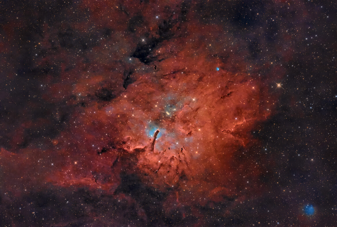 Il centro dell’ammasso aperto ha circa due milioni di anni ed è formato prevalentemente da molte giovani stelle blu luminose. Le parti esterne dell’ammasso, che coinvolgono da vicino i pilastri della nebulosa, contengono stelle ancora più giovani. Gli enormi pilastri si formano probabilmente quando il gas e la polvere circostanti vengono spinti ed erosi dalla radiazione delle stelle vicine.