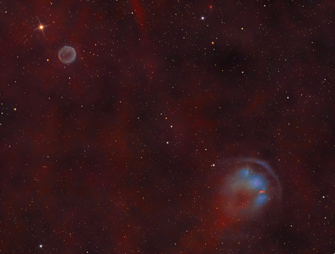 HFG1 (Heckathorn-Fesen-Gull 1) e Abell 6 costituiscono un’interessante coppia di nebulose planetarie (PN). Abell 6 ha l’aspetto a bolla tipico della maggior parte delle PN, è molto debole (Mag = 15) e ha un aspetto blu dovuto alla ionizzazione dell’ossigeno (OIII), nonostante abbia anche una componente H-alpha abbastanza forte. Scoperta nel 1982, HFG1 (PK 136+05) ha una struttura più complessa: presenta un arco opposto alla coda, nella direzione del movimento della nebulosa, il che suggerisce che si tratti di un fronte d’onda d’urto della materia che interagisce con il mezzo interstellare. La nebulosa planetaria è formata da un sistema binario composto da una nana bianca e una gigante rossa. Le due stelle sono molto vicine e ruotano l’una attorno all’altra in sole 14 ore.