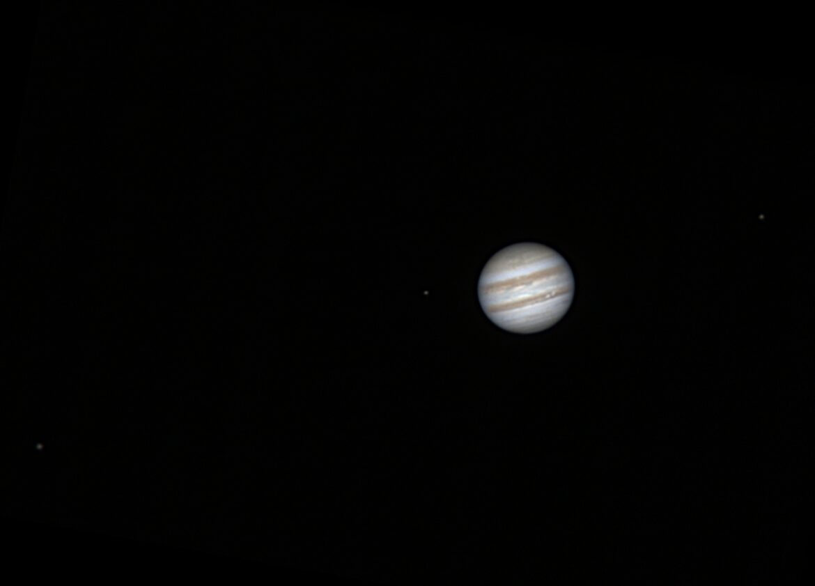 Una bella foto del pianeta Giove una settimana prima dell’opposizione del 7 dicembre, quindi quasi alla minima distanza dalla Terra. Da sinistra si vedono i satelliti Ganimede, Europa e Io, inoltre si vedono facilmente due macchie bianche sulla banda equatoriale sud.