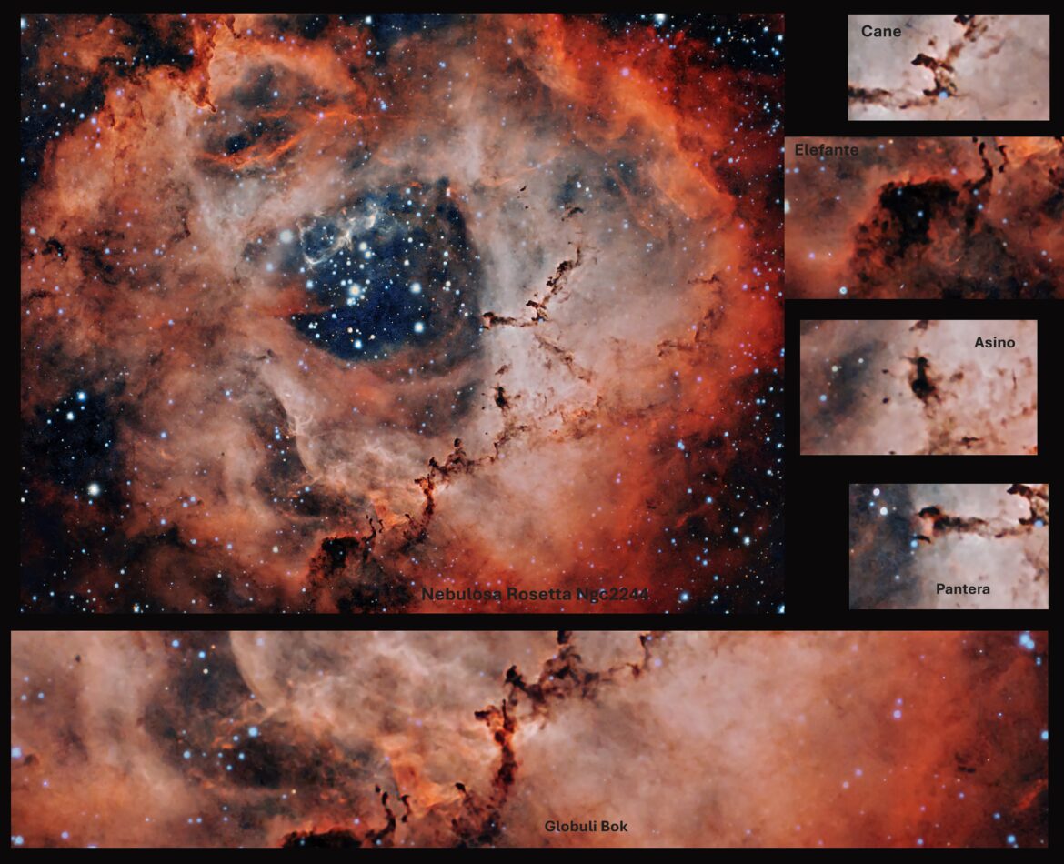 La Nebulosa Rosetta Ngc2244, un classico del periodo invernale, presenta molti moduli di Bok, aggregazioni di polveri scure e densi gas che sono sede di formazioni stellari. Alcuni di questi hanno forme di animali ( pantera, cane, elefante, asino) che molti appassionati rilevano. La distanza dalla Terra è di circa 5.200 anni luce