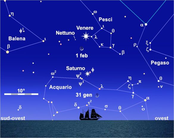 Allo spegnersi delle luci del tramonto, a occidente si nota la brillante presenza di Venere, preceduta, una decina di gradi più vicina all’orizzonte, dalla più modesta scintilla di Saturno. La distanza che li separa va progressivamente ampliandosi dopo la congiunzione dello scorso 20 gennaio.