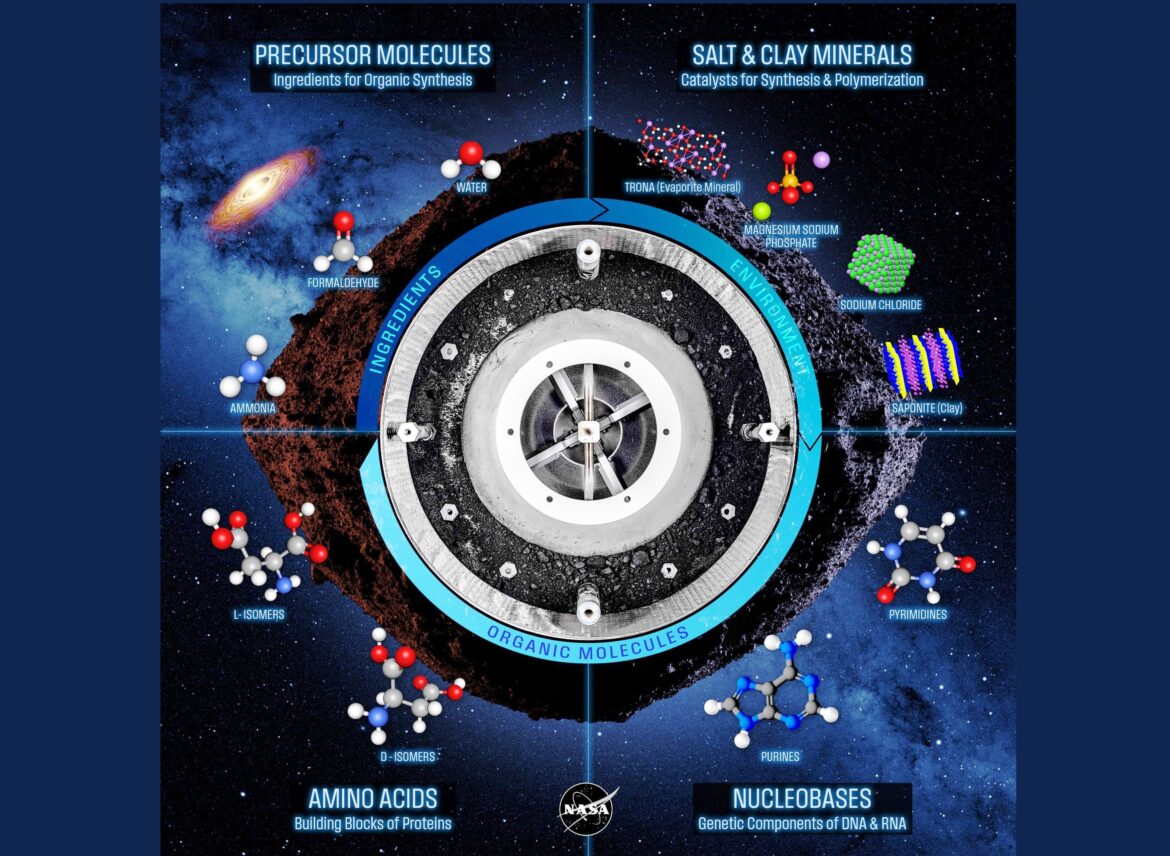 Nei campioni dell’asteroide Bennu prelevati e portati a terra dalla sonda Osiris-Rex nel 2023, sono stati scoperti 14 dei 20 amminoacidi presenti sulla Terra e tutte e cinque le basi, ossia le “lettere dell’alfabeto della vita” che si trovano nelle molecole di Dna e Rna (adenina, guanina, citosina, timina e uracile). Sono inoltre stati scoperti sali minerali che si sono formati nel corpo celeste dal quale ha avuto origine Bennu, in seguito a un impatto, e che permettono di avere informazioni sulla chimica del Sistema solare primitivo.