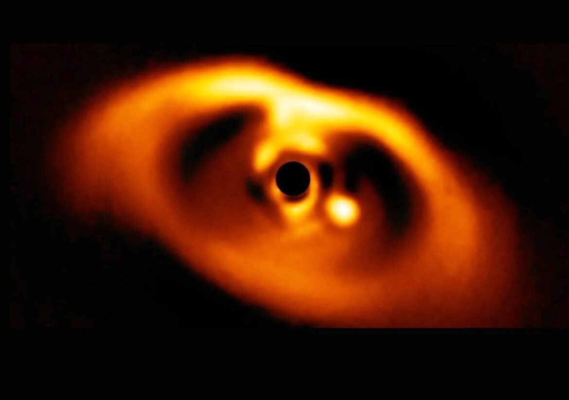 In figura, il sistema Pds 70 ripreso con lo strumento Sphere del Very Large Telescope dell’Eso in Cile. Si nota uno dei pianeti in formazione (il punto luminoso a destra, all’interno dell’anello), mentre al centro c’è la stella, mascherata dal coronografo.