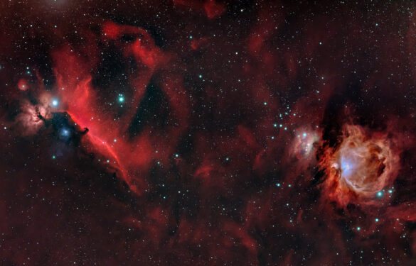 Un classico delle riprese invernali, le nebulose di Orione, Fiamma e Testa di Cavallo. E’ un target che è stato ripreso a campo largo da Milano con Askar 230. La zona è una delle più belle da riprendere per le sue forme caratteristiche e i colori presenti dovuti a forti presenze di idrogeno ed ossigeno ionizzati
