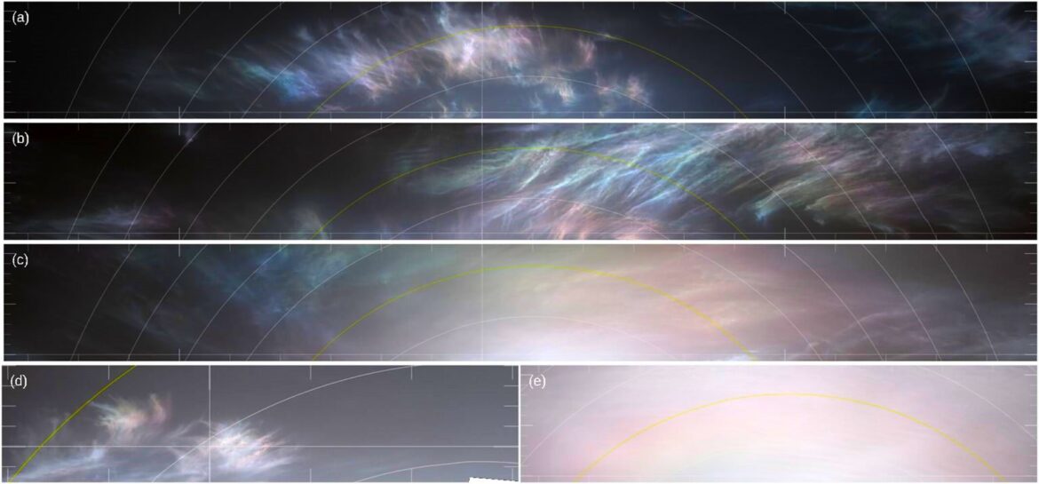 Grazie alla diffusione della luce solare durante il tramonto marziano, queste nubi creano un effetto visivo simile a quello delle nubi iridescenti terrestri. Note come nubi crepuscolari o nottilucenti, queste formazioni atmosferiche si riscontrano quando il Sole tramonta e illumina le nubi alte, creando delle iridescenze, un fenomeno che si verifica solo quando le nuvole marziane si trovano ad altitudini particolarmente elevate, comprese tra i 60 e gli 80 chilometri.