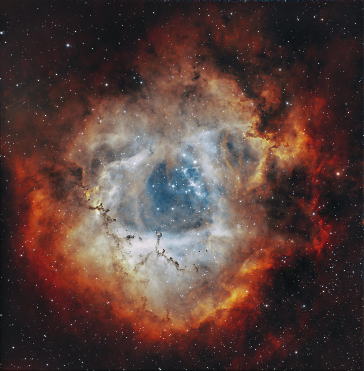 Le immagino sono state acquisite in 4 notti dal 3 marzo al 6 marzo 2025 e i colori dell’elaborato in banda stretta, rappresentano diversi elementi chimici: l’ idrogeno (Hα) in rosso, l’ ossigeno (OIII) in blu e lo zolfo (SII) in tonalità aranciate e dorate.