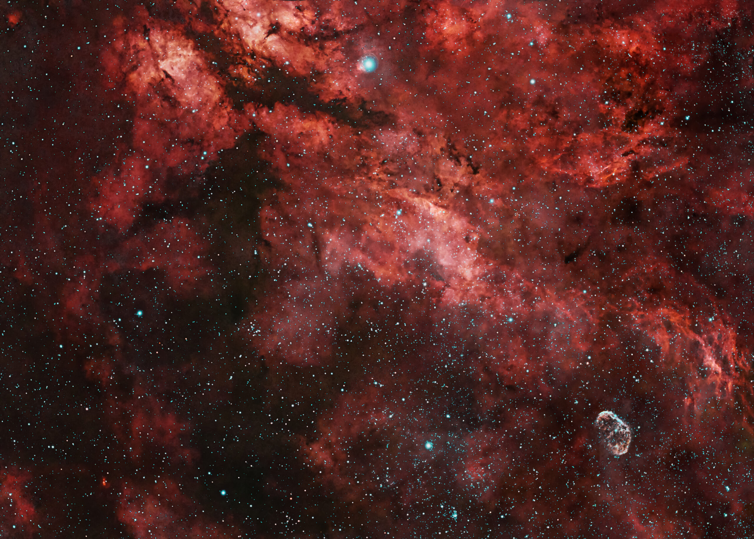 NGC 6888 detta Nebulosa Crescent, è una nebulosa diffusa visibile nella parte meridionale della costellazione del Cigno, dista dalla Terra circa 5.000 anni luce. Si tratta di una tipica bolla di vento stellare generata da una massiccia stella di Wolf-Rayet che si trova al suo interno. Questa stella sarebbe anche la responsabile della nebulosa. In alto si nota la brillante stella Sadr