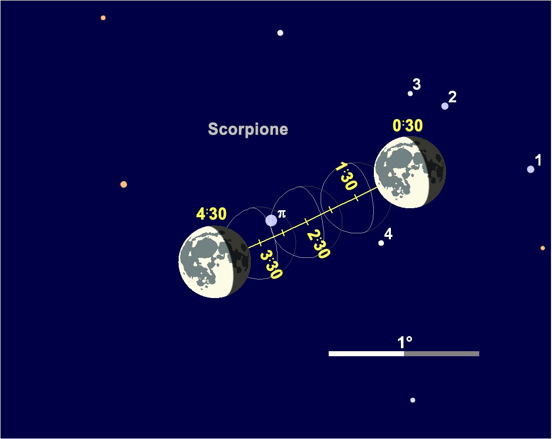 Nelle primissime ore del giorno 20 la Luna gibbosa calante, illuminata per il 73%, occulta la stella Pi Scorpii, di magnitudine +2,9; la scomparsa, il cui istante preciso varia tra le 02:20 (Cagliari) e le 02:39 (Lecce) a seconda della località d’osservazione, avviene dietro il bordo lunare illuminato dal Sole.