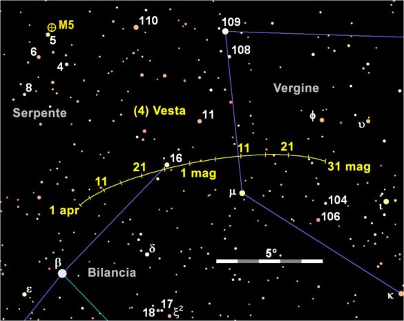 Nei mesi primaverili è possibile osservare il pianetino (4) Vesta, il membro più luminoso della Fascia degli asteroidi. In opposizione al Sole il giorno 2 maggio nei pressi del confine che separa le costellazioni della Vergine e della Bilancia, (4) Vesta raggiunge la magnitudine visuale +5,7, ed è teoricamente osservabile anche a occhio nudo sotto cieli bui, ma anche il più modesto ausilio ottico consentirà di individuarlo con facilità. A questo fine, degno di nota è il transito di (4) Vesta 10’ a sud-ovest della stella 16 Librae, di magnitudine +4,5, la sera del 26 aprile.